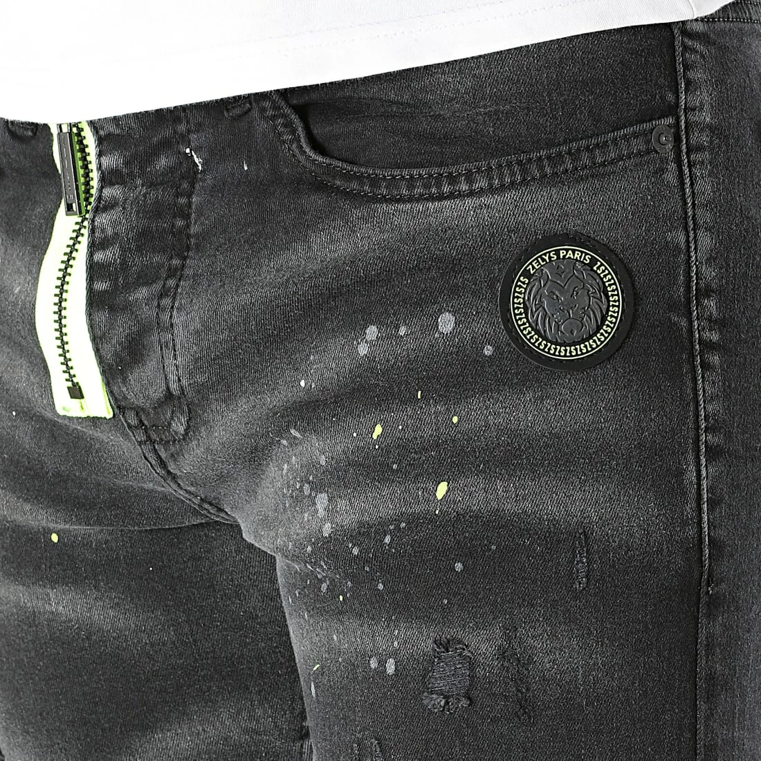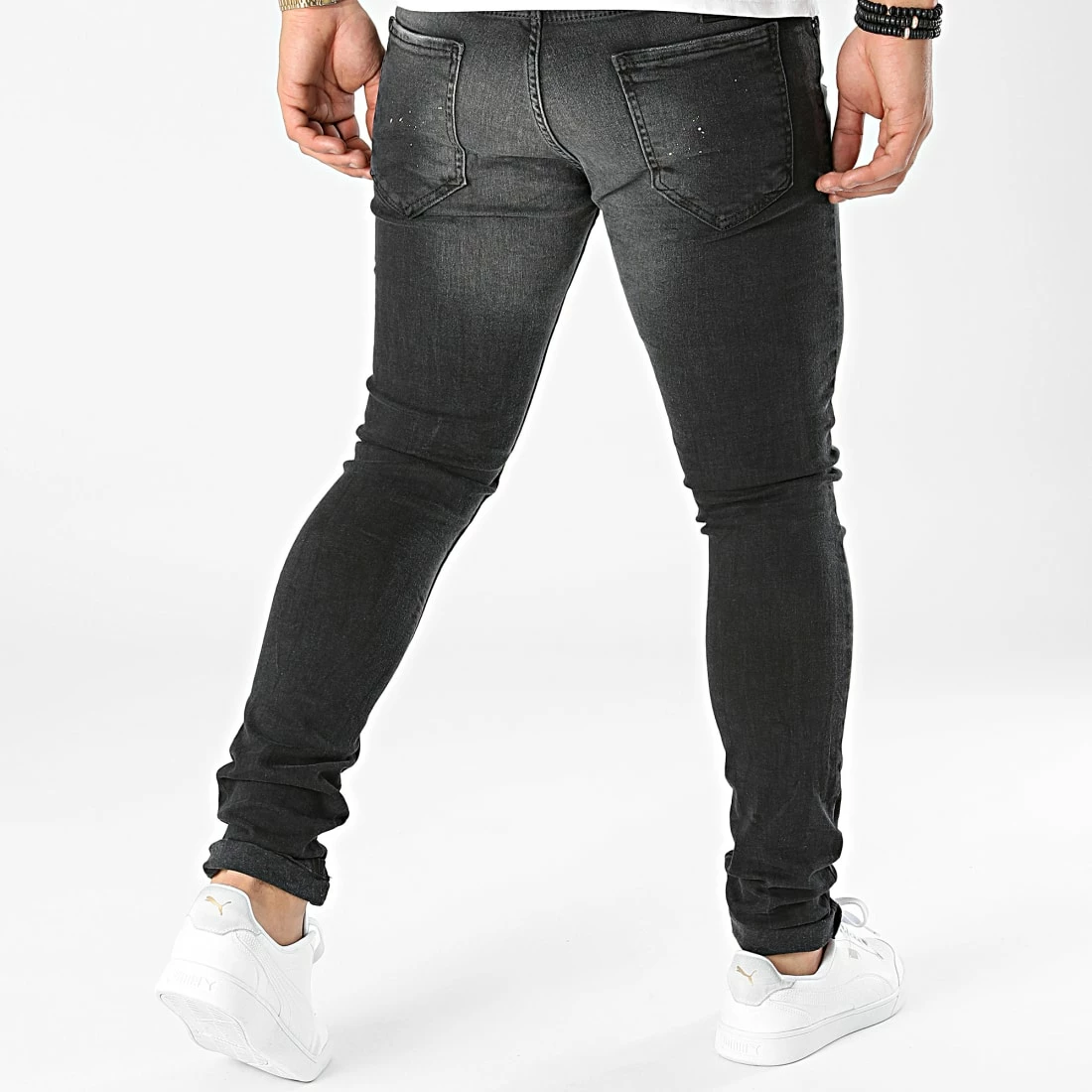 • Jean stretch à finition délavée, usée et tachée avec rapiéçages